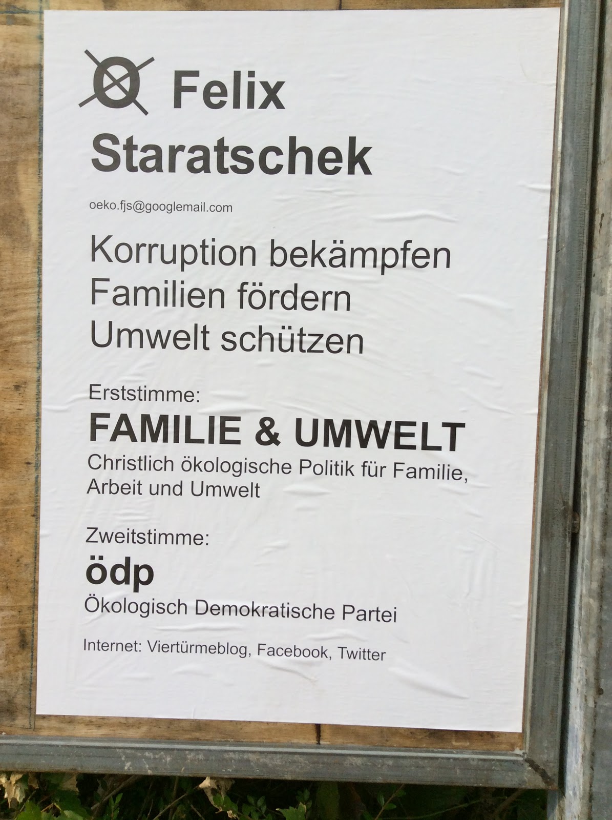 Das Wahlplakat von Felix Staratschek: Kennworte: FAMILIE & UMWELT Christlich ökologische Politik für Familie, Arbeit und Umwelt Korruption bekämpfen Familien fördern Umwelt schützen |