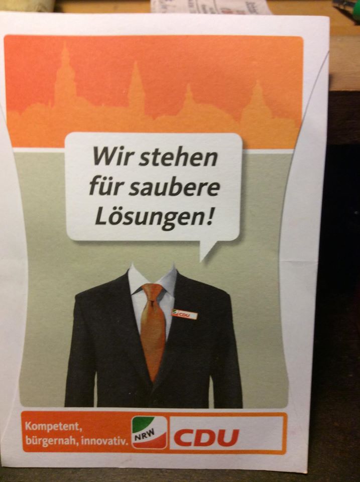 Irgendwie wirkt die Politik der CDU in Radevormwald kopflos! Wenn wenigsten die Lösungen der CDU Radevormwald sauber wären. Denn "kompetent, Bürgernahund innovativ" sieht anders aus, als es die CDU hier seit Jahren anbietet. (Der von Christian Viebach zur Bürgermeisterwahl 2015 verteilte "Flusenentferner" mit einem treffenden Motiv.)