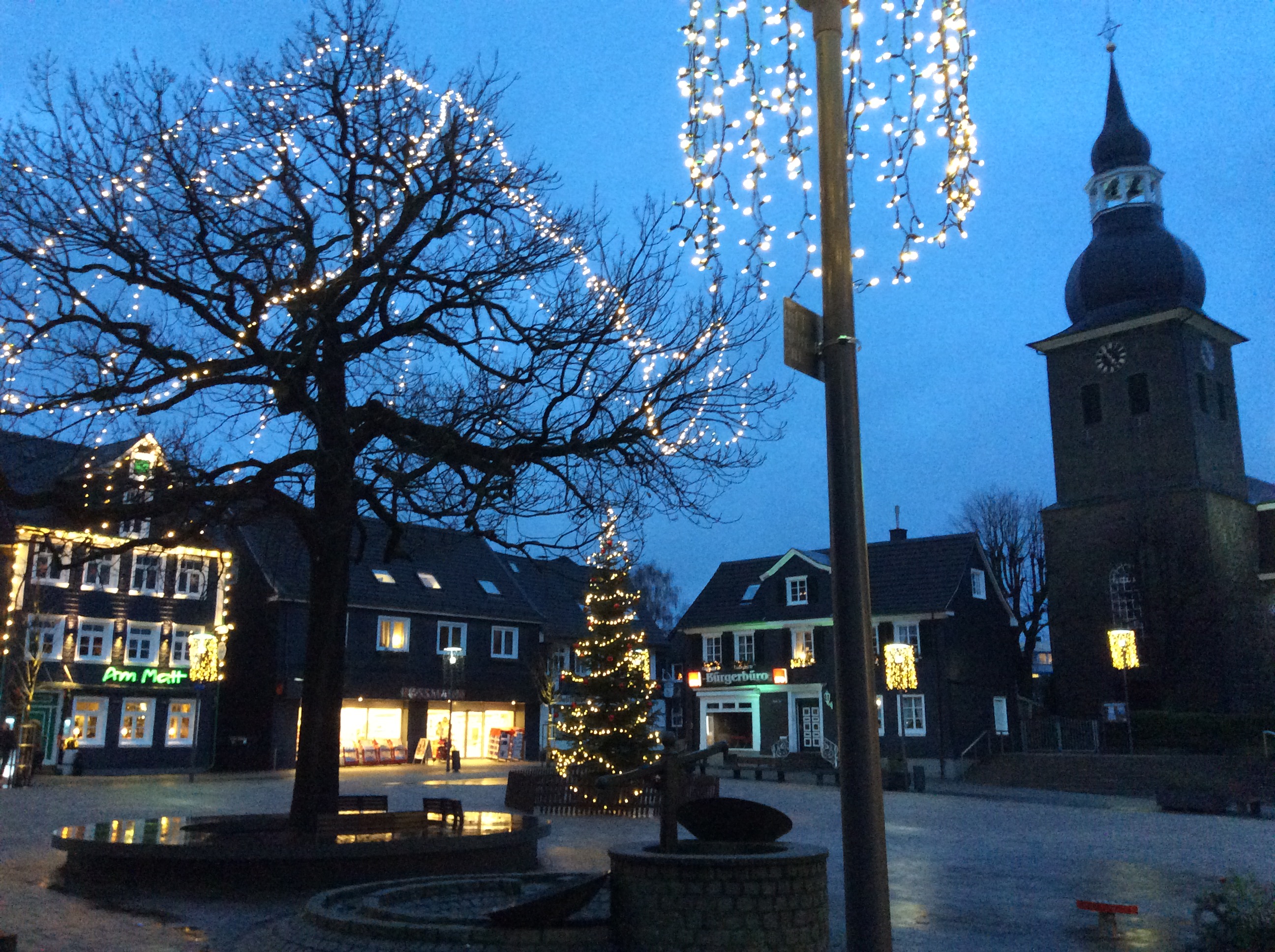 | Der Marktplatz in Radevormwald im weihnachtlichen Schmuck. Die Innenfläche des Platzes soll an Fritz Gerlich erinnern, der von 1930 bis 1933 publizistisch versuchte, die Machtübernahme der Nazis zu verhindern und dafür 1934 mit dem Leben bezahlte. |